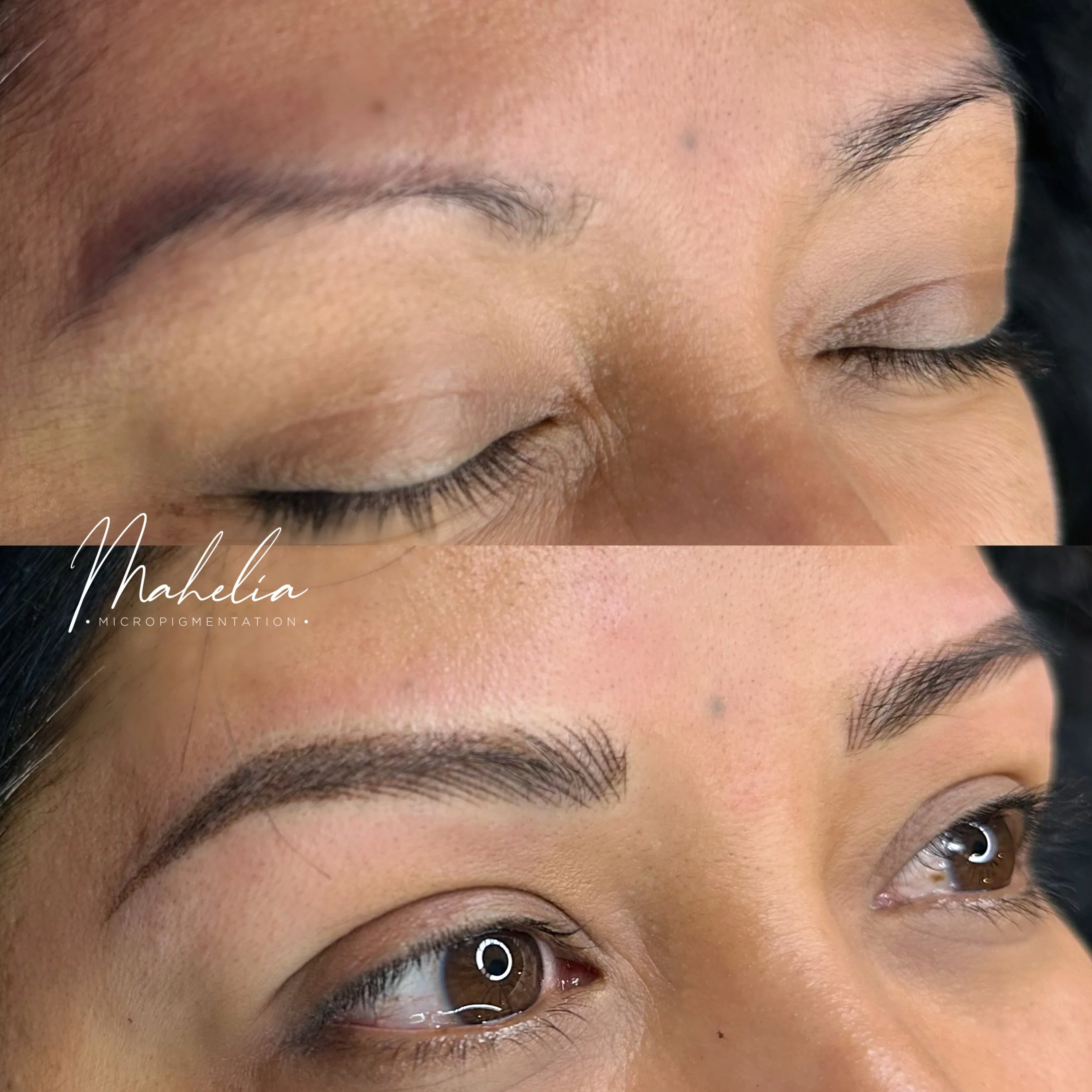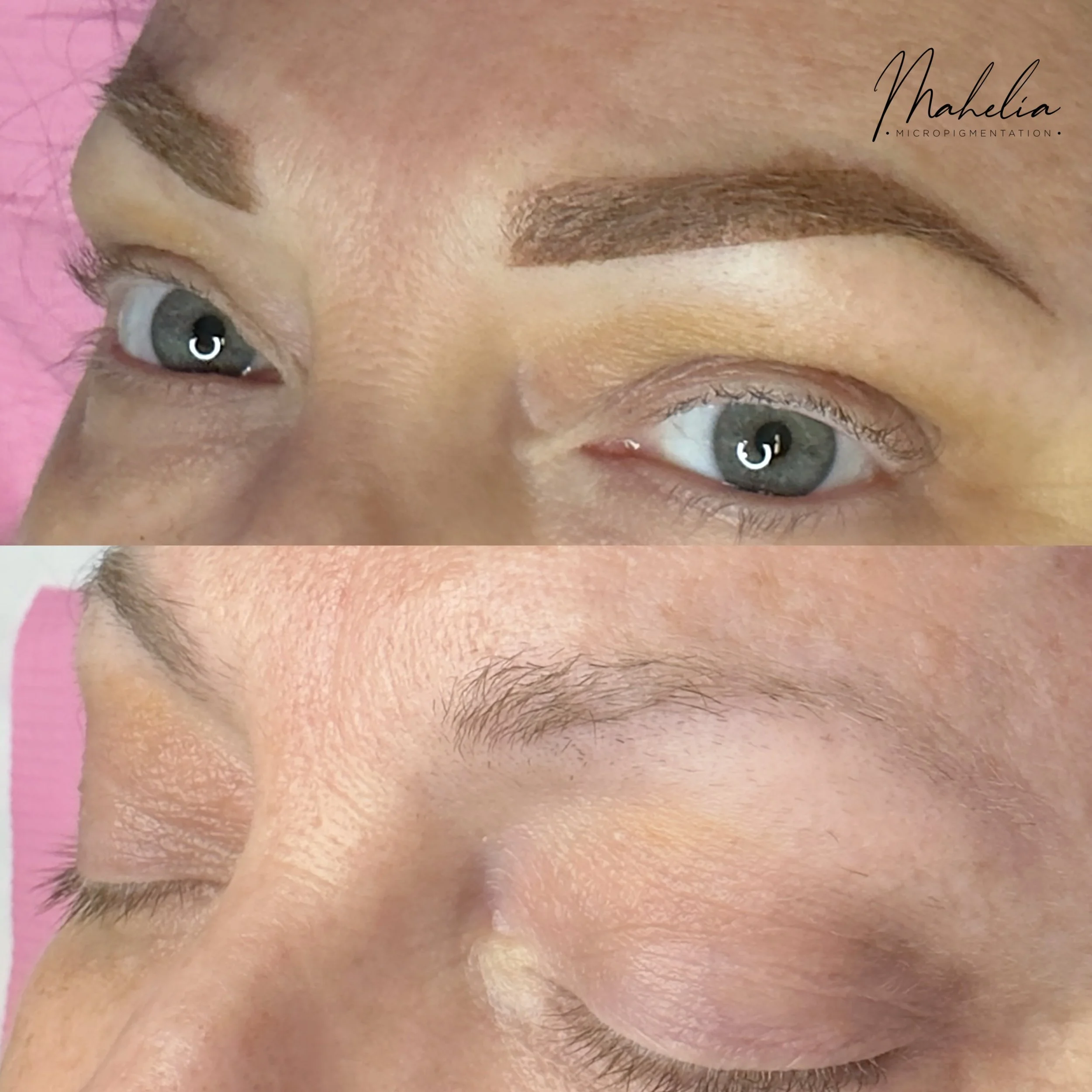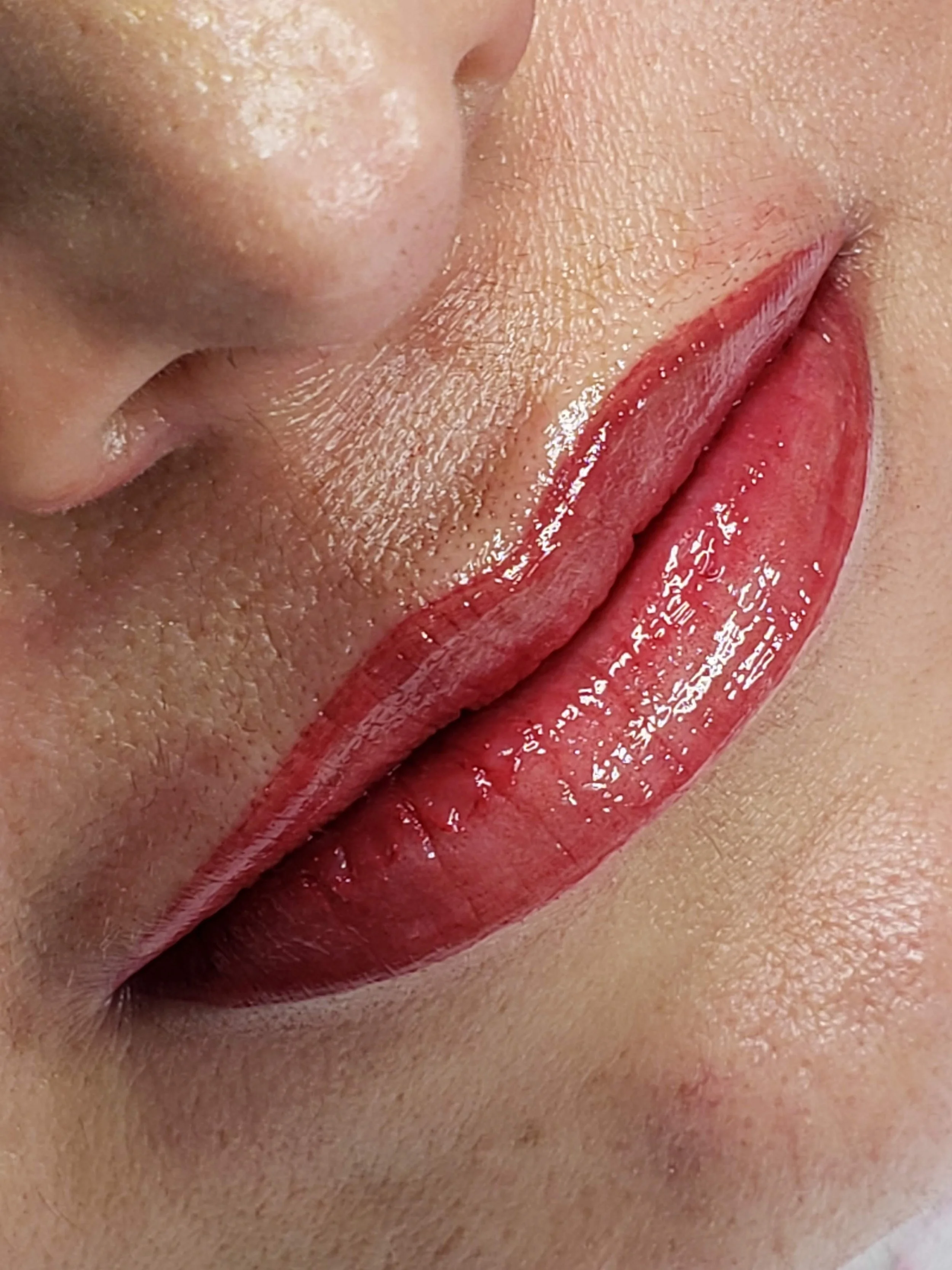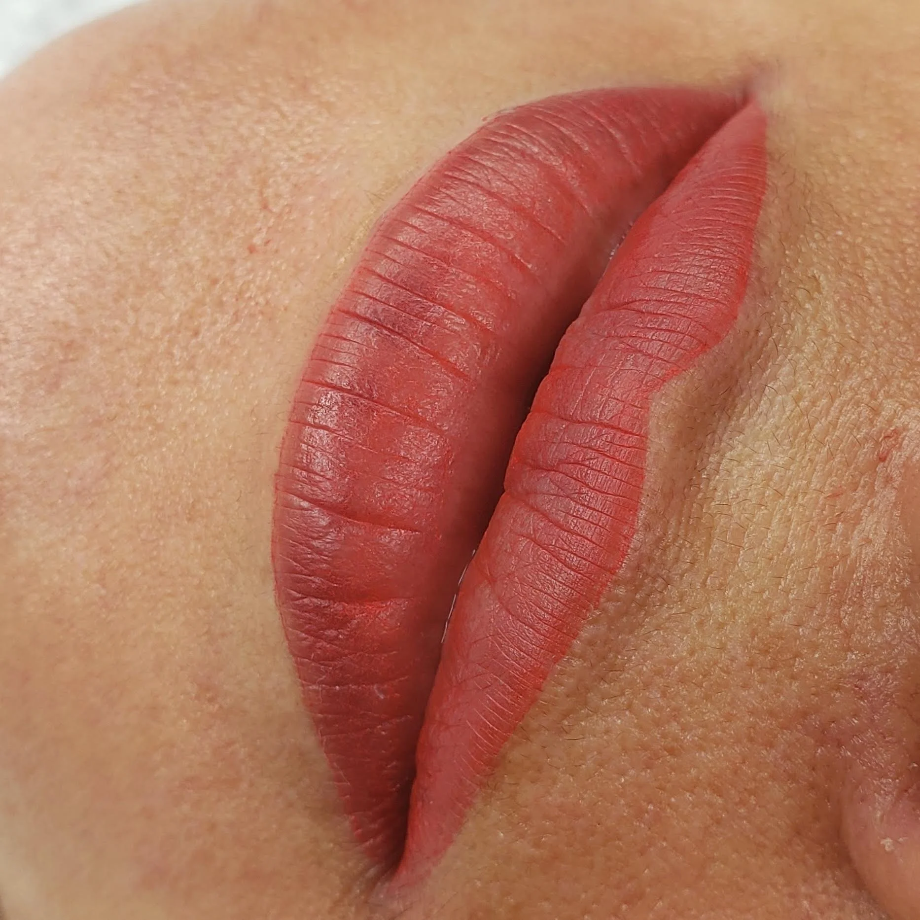 Close-up of lips before and after micropigmentation treatment, showing enhanced color and symmetry.